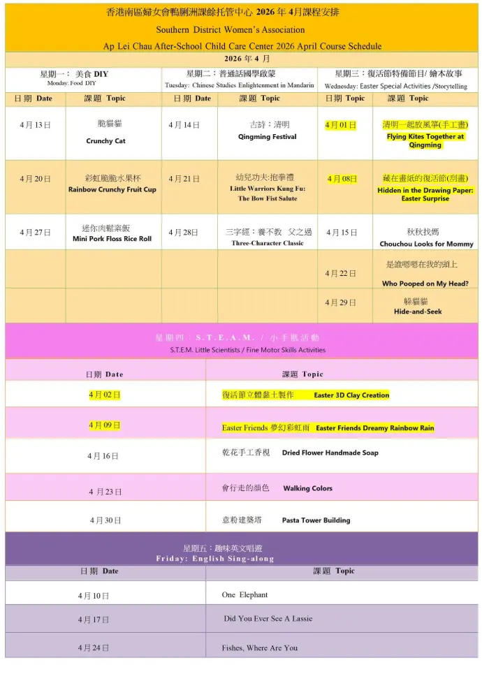 26年4月精彩課程來了!香港南區婦女會鴨脷洲課後托管中心